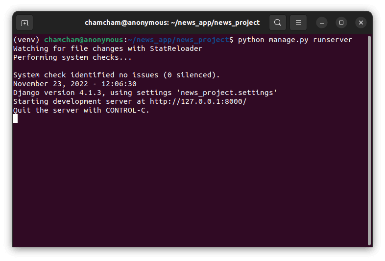 A Django project can contain several Django apps. An app is a small library representing a larger project subset. We will create a new app, news_app: