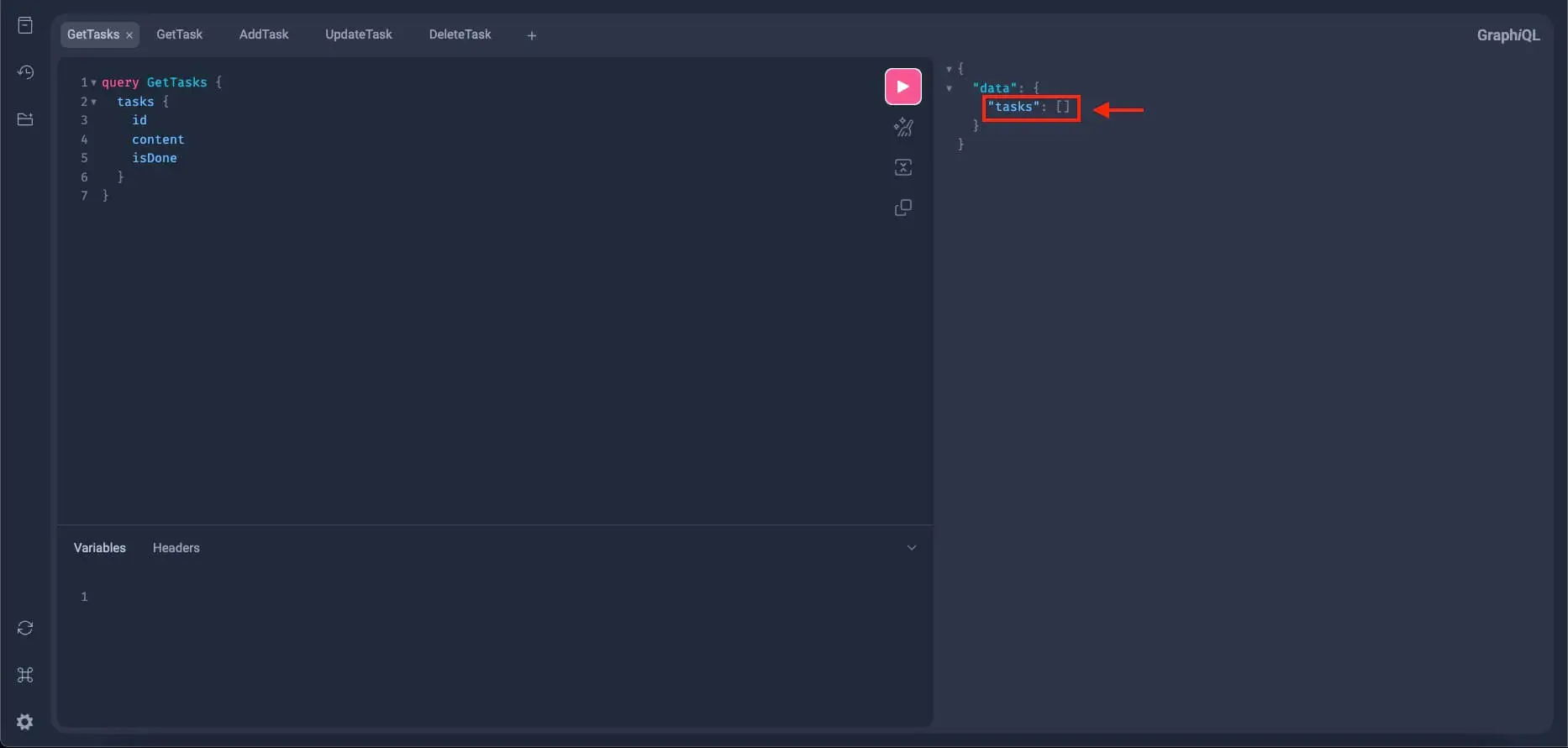 Paste this GraphQL query to the left panel of your GraphiQL and click the play button. Since we haven't added anything to our tasks yet, we’re expecting to receive an empty list.