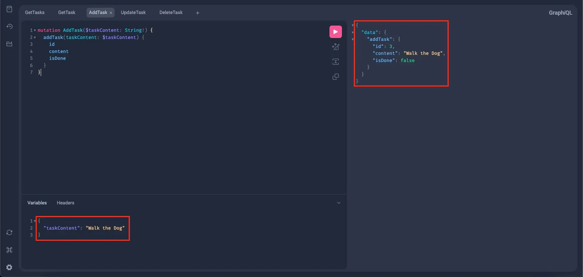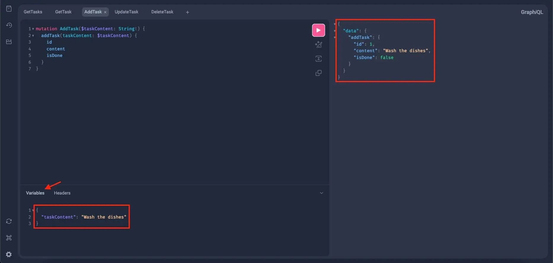 Notice that we have input here; $taskContent which is a required string (String!) parameter, since, as you can remember, the add_task resolver from earlier accepts one required parameter: task_content, to create a new task.