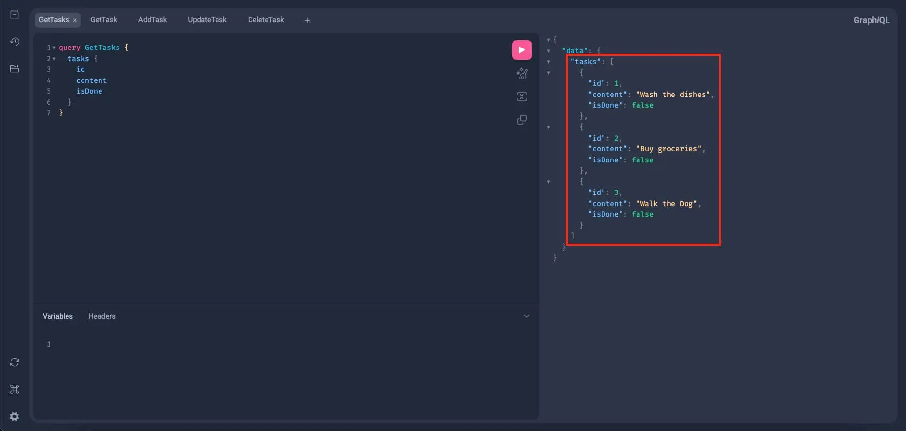 Alright, we will now query all the tasks we added to verify if the add_task and get_tasks mutation resolvers are working properly.