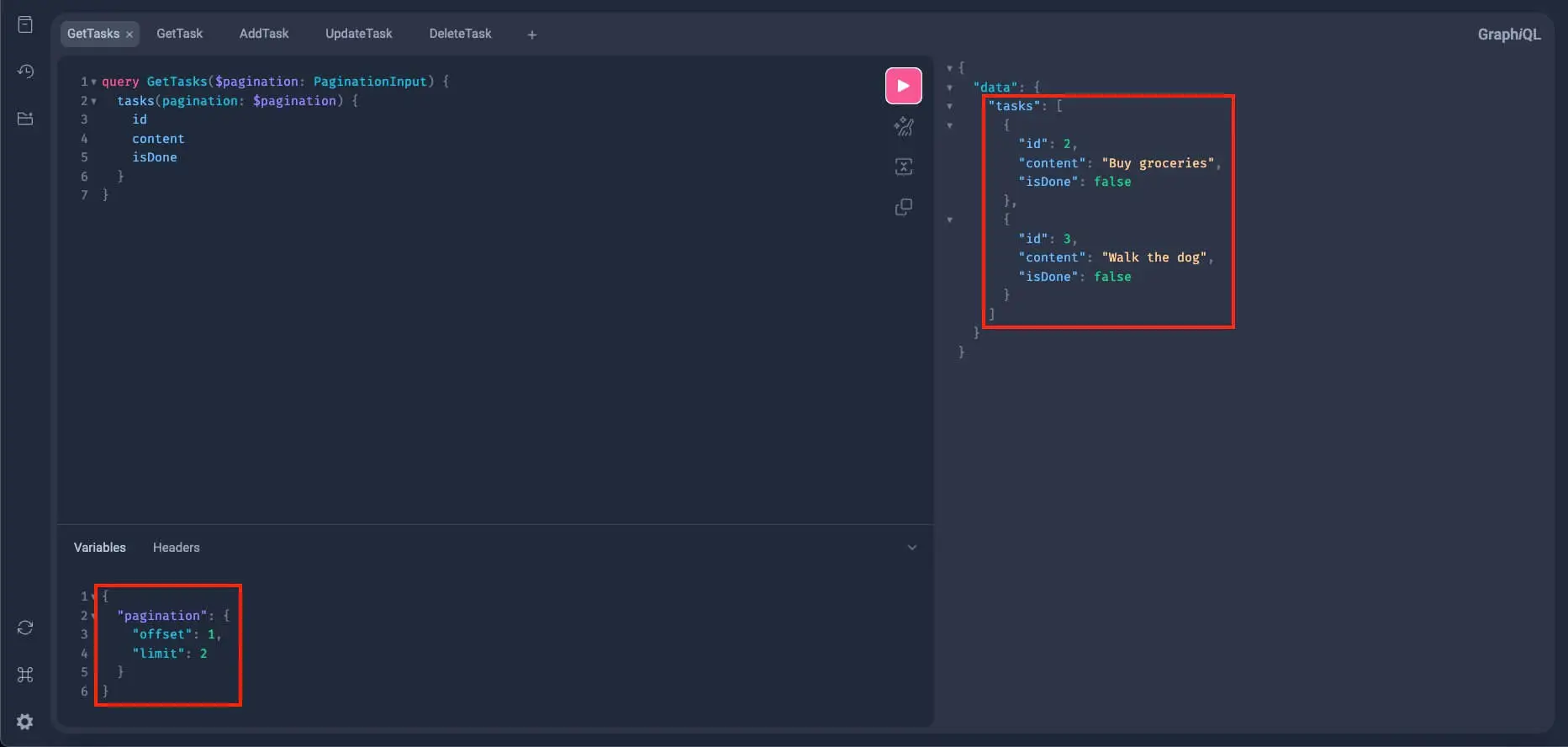 If you get all the tasks we added earlier (like what we have here), that means the add_task mutation resolver is working properly. For the get_tasks, we need to further test it out with pagination.