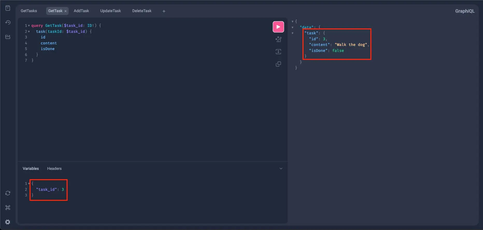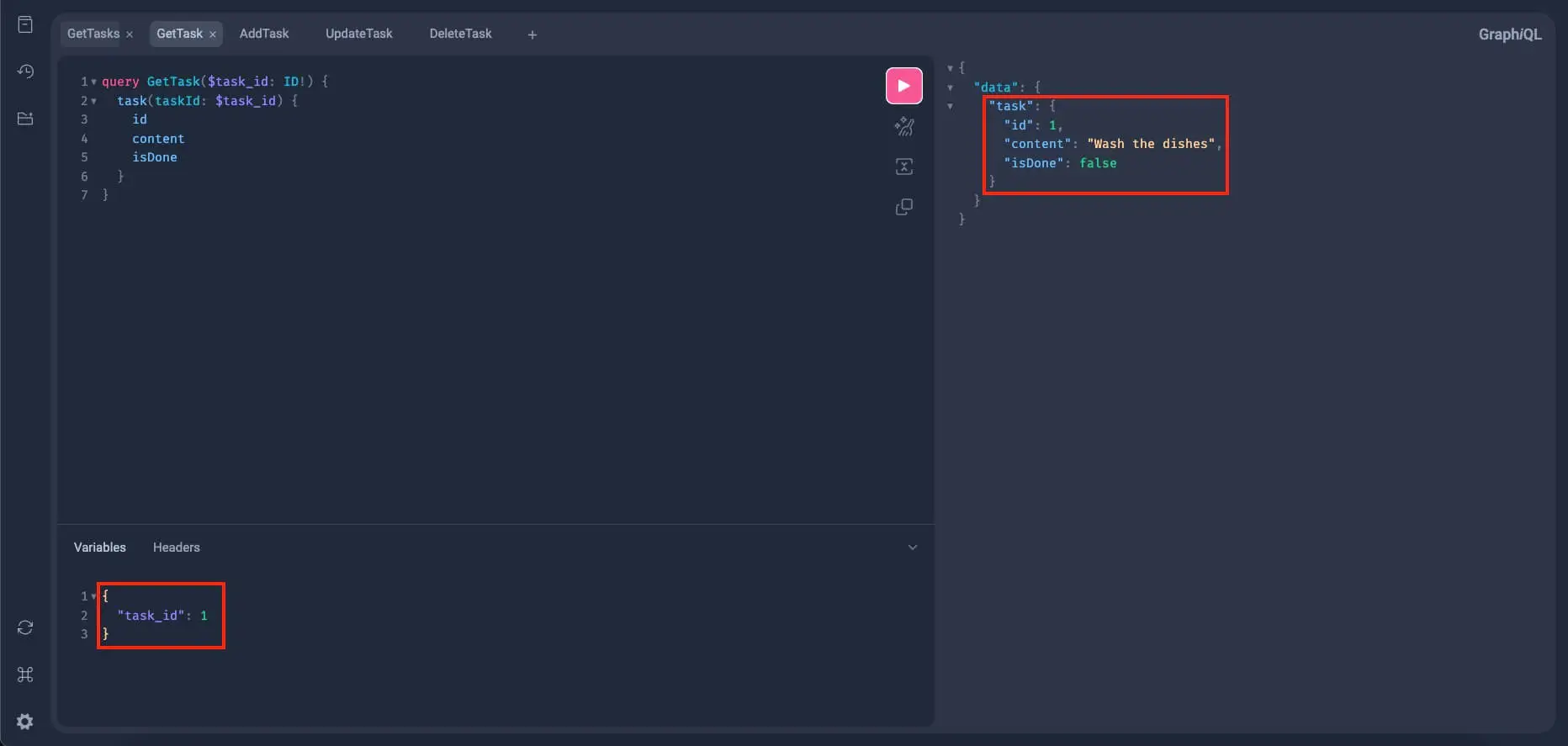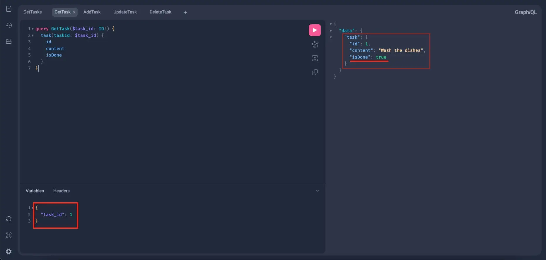 Alright, great! Now let's try this on the GetTask query and query this task. Remember that it has an id of 1. Again, we're expecting is_done to be updated to true: