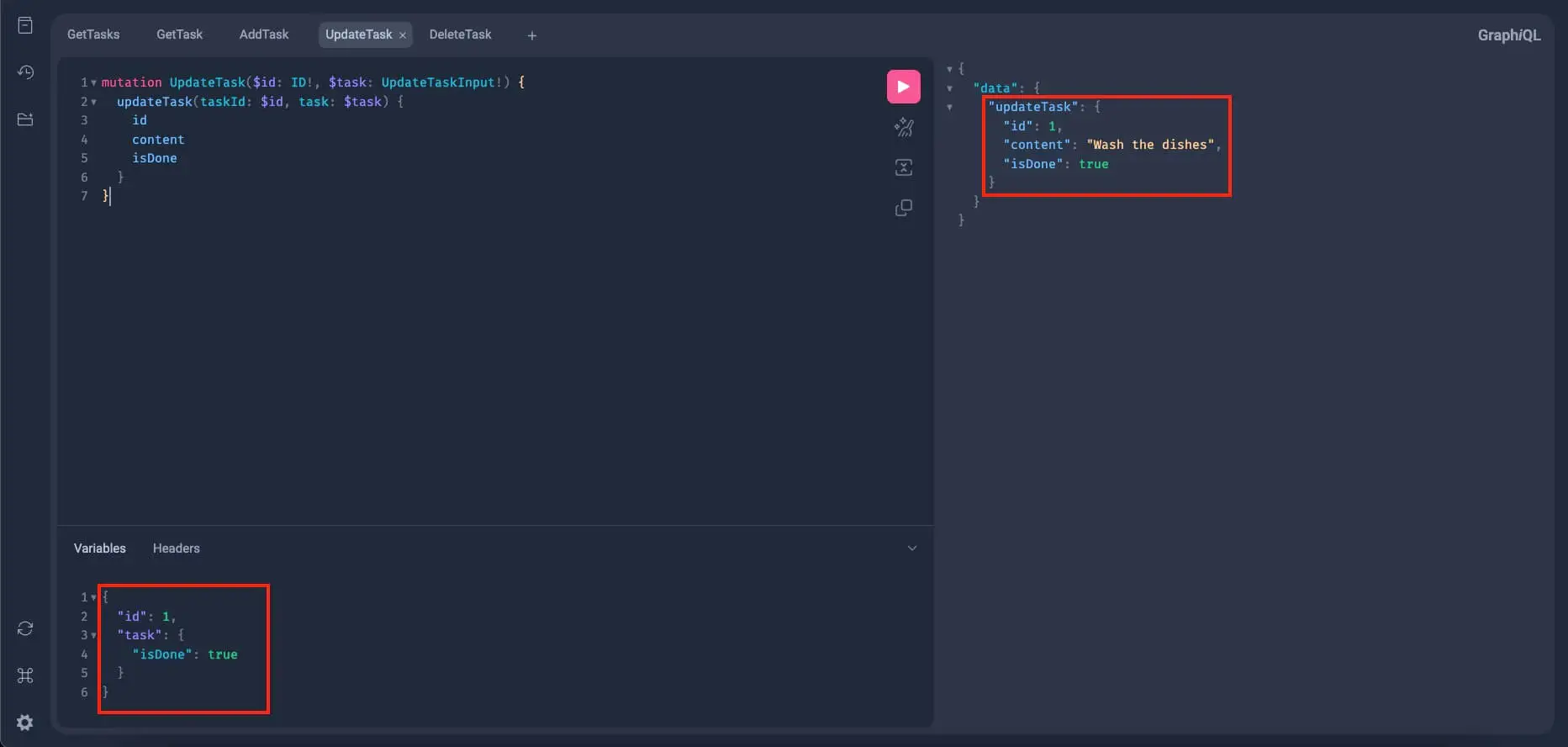 Notice that the content and is_done attributes of UpdateTaskInput are both optional and they default to None as defined earlier from the update_task() resolver method.