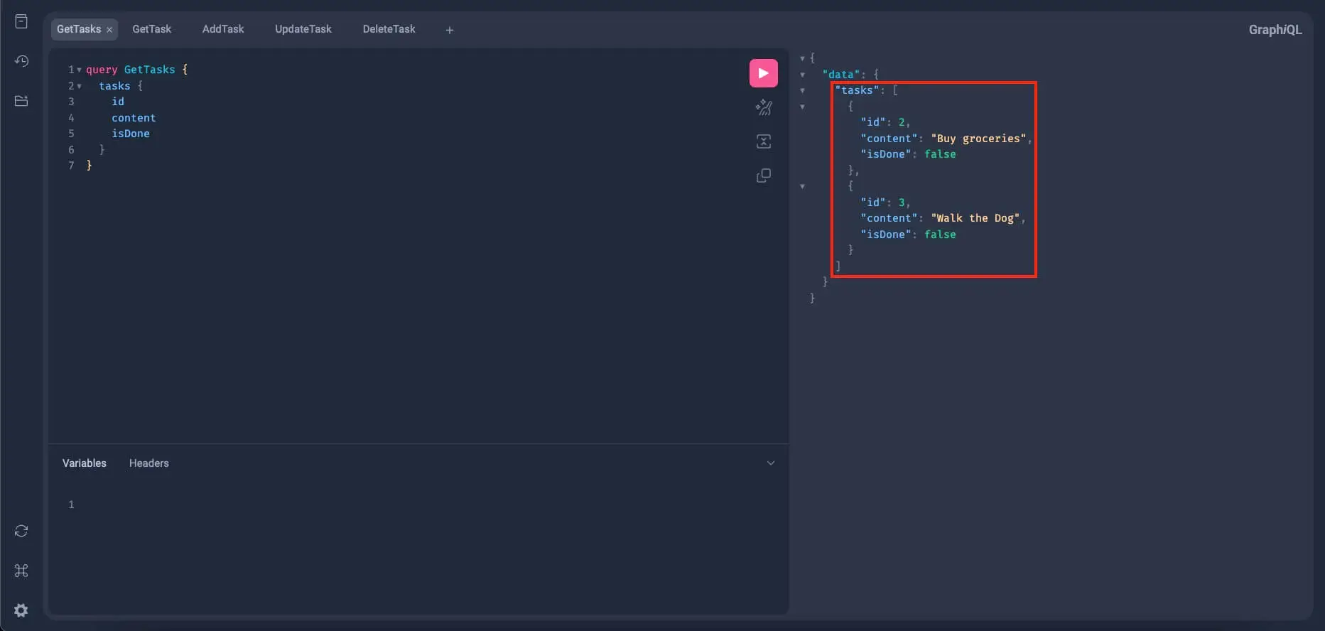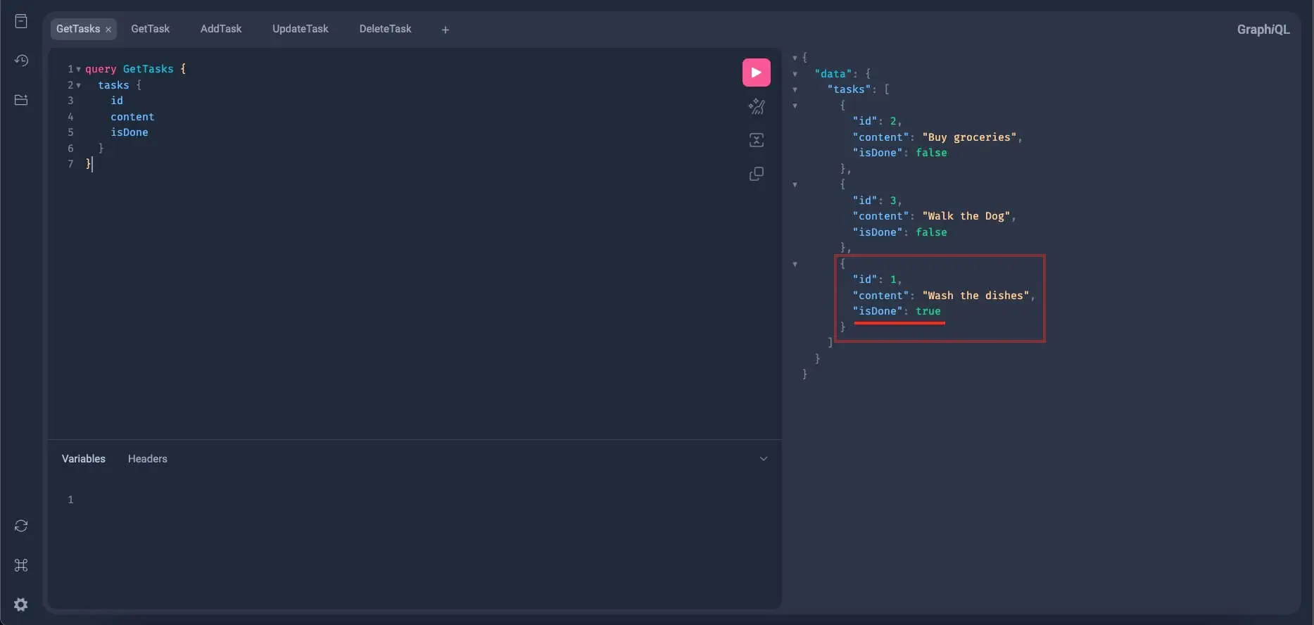 Alright, now to test if the update mutation really took effect, let's go back to the GetTasks query, remove the pagination input from the Variables section, and re-run the query. If everything works properly, the task with an id of 1 should have its isDone set to true: