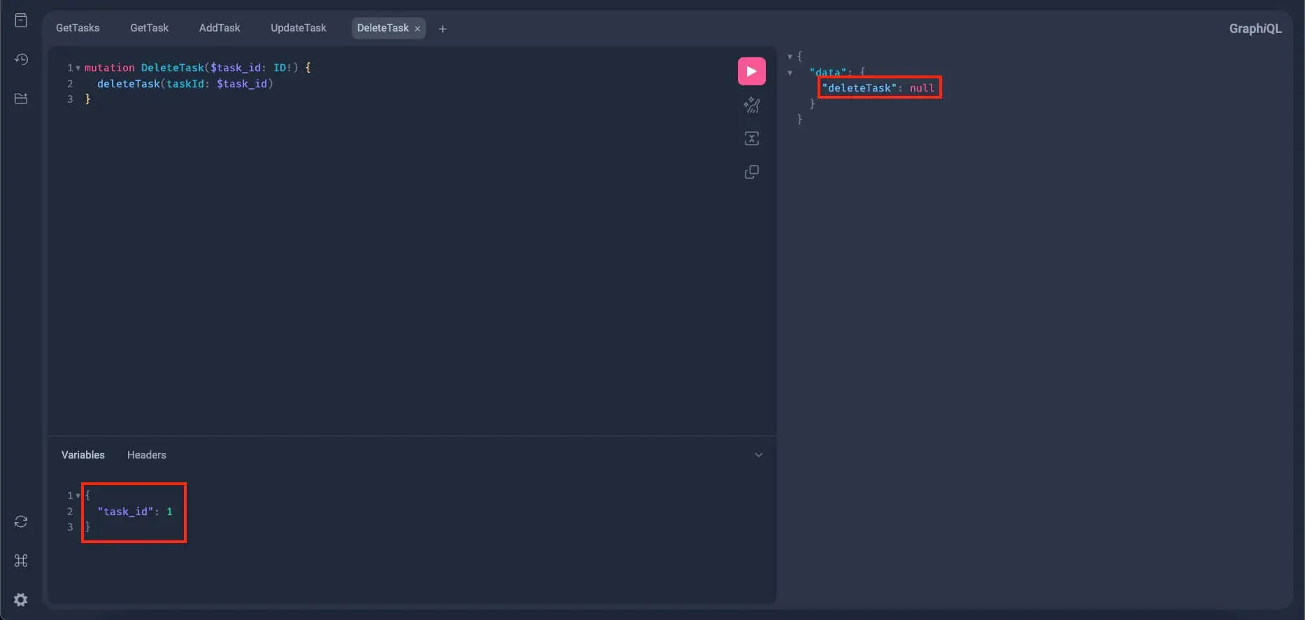 The delete mutation always returns a null, thus, we don't have anything to query from its return value. And also, we have input here, the $task_id, which the delete mutation will use to target the task to be deleted.