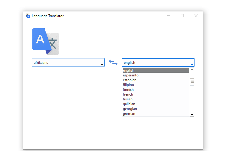 language_data = googletrans.LANGUAGES: Gets a dictionary of all the supported languages and their corresponding language codes using the googletrans.LANGUAGES attribute.language_values = language_data.values(): Extracts the language names from the dictionary by calling the values() method on language_data.languages = list(language_values): Converts the language names into a list.self.from_language = ttk.Combobox(self.canvas, width=36, bootstyle='primary', values=languages): Creates a Combobox widget for selecting the source language with a width of 36 characters, and sets the available values to the languages list. bootstyle='primary' sets the color of the Combobox to the primary theme color of the widget set.self.from_language.current(0): Sets the default selected value of the Combobox to the first item in the languages list.self.canvas.create_window(150, 140, window=self.from_language): Adds the Combobox widget to the Canvas widget at the specified position.self.arrow_icon = ttk.PhotoImage(file='arrows.png'): Loads an image file named "arrows.png" and creates a PhotoImage object called self.arrow_icon.self.resized_icon = self.arrow_icon.subsample(15, 15): Resizes the self.arrow_icon PhotoImage object by a factor of 15 in both the x and y dimensions.self.image_label = ttk.Label(self.master, image=self.resized_icon): Creates a Label widget with the resized_icon PhotoImage object as its image.self.canvas.create_window(300, 140, window=self.image_label): Adds the Label widget to the Canvas widget at the specified position.self.to_language = ttk.Combobox(self.canvas, width=36, bootstyle='primary', values=languages): Creates a Combobox widget for selecting the destination language with a width of 36 characters, and sets the available values to the languages list.self.to_language.current(21): Sets the default selected value of the Combobox to the 22nd item in the languages list.self.canvas.create_window(450, 140, window=self.to_language): Adds the Combobox widget to the Canvas widget at the specified position.The output we get after adding the above code will look as follows: