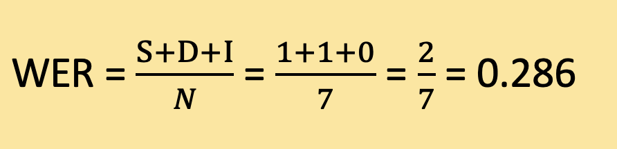 Therefore, the Word Error Rate for this example is approximately 0.286 or 28.6%. This means that out of the total words in the reference text, around 28.6% were either substituted or deleted in the recognized text.