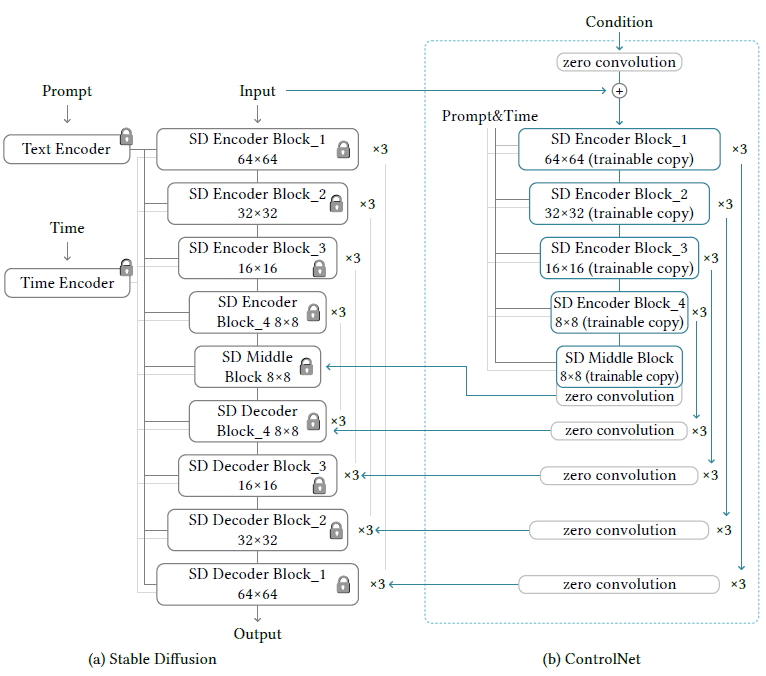 The stable diffusion model is a U-Net with an encoder, a skip-connected decoder, and a middle block. As shown in the diagram, both the encoder and the decoder have 12 blocks each (3 64x64 blocks, 3 32x32 blocks, and so on). The diffusion models also work by converting the original 512x512 images into the smaller 64x64 latent images for stabilized learning. This makes it necessary to convert the image-based conditions to the 64x64 size so as to match the convolution size. To achieve this, a tiny network of four convolution layers with 4x4 kernels and 2x2 strides is used.