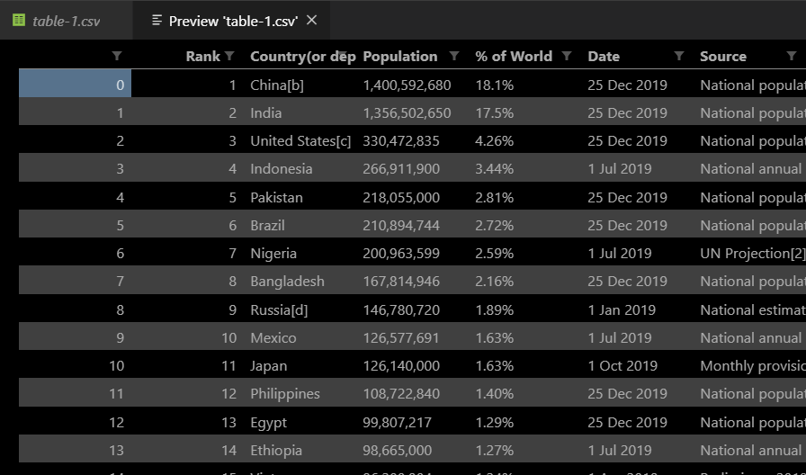 C:\pythoncode-tutorials\web-scraping\html-table-extractor>python html_table_extractor.py https://en.wikipedia.org/wiki/List_of_countries_and_dependencies_by_population