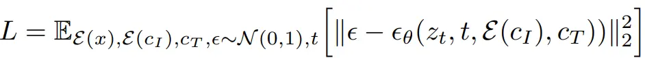 It minimizes the difference between the actual noise from the predicted noise conditioned on the text instruction (c_T) and the given image (c_I). z_t represents the image latent at timestep t.
