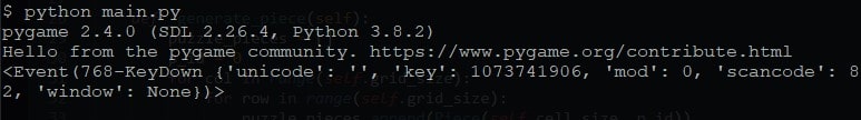 Let's modify the code from main() method in Puzzle class, we will make it capture keys pressed and apply our arrow_key_clicked() method to check if the key pressed was an arrow key: