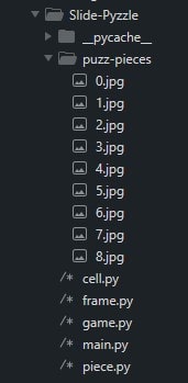 Finally, create a folder named puzz-pieces inside the Slide-Puzzle directory. This folder will contain the images for our puzzle pieces. Paste inside the puzz-pieces directory your puzzle pieces pictures. If you don't have piece pictures, you can access my piece pictures here.
